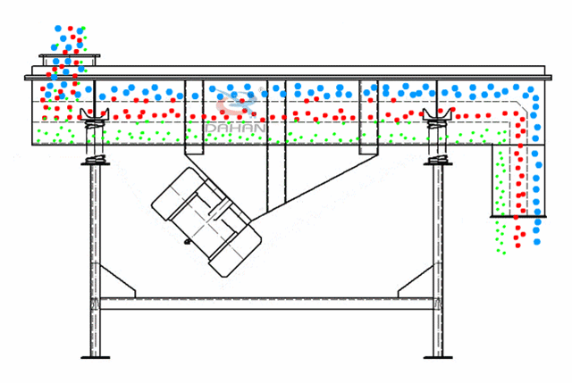 原理是利用振動電機(jī)激振器作為振動源,使物料在篩網(wǎng)上被拋起,同時(shí)向前作直線運(yùn)動,物料從給料機(jī)均勻地進(jìn)入篩分機(jī)的進(jìn)料口,通過多層篩網(wǎng)產(chǎn)生數(shù)種規(guī)格的篩上物、篩下物、分別從各自的出口排出。