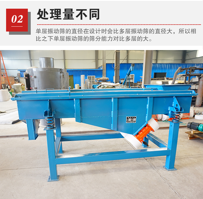 物料篩分產(chǎn)量是由篩網(wǎng)的直徑,也就是物料與篩網(wǎng)的接觸面積有直接關(guān)系的。而單層振動篩的直徑在設(shè)計時會比多層振動篩的直徑大,所以相比之下單層振動篩的篩分能力對比多層的大。