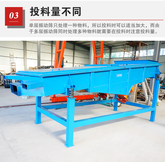 物料的篩分能力是由投料的大小有著直接關(guān)系的,由于單層振動篩只處理一種物料,所以投料時可以適當(dāng)加大,而由于多層振動篩同時處理多種物料就需要在投料時注意投料量。