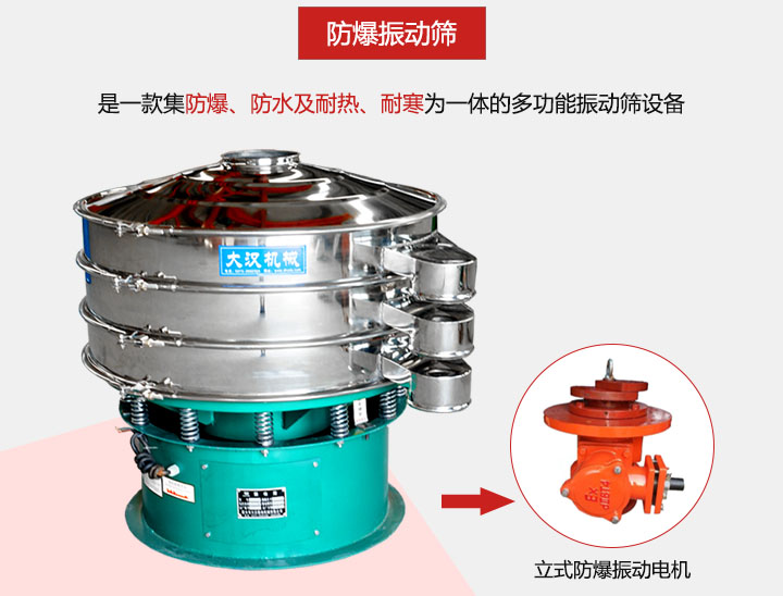 防爆振動篩是針對一些易產生爆炸行業的研發設計而成,是一款集防爆、防水及耐熱、耐寒特殊要求的場合為一體的多功能振動篩設備,能夠實現該功能主要原因是防爆振動篩采用的是立式防爆振動電機。