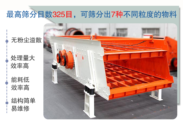 具有能耗低、效率高、結(jié)構(gòu)簡單、易維修、全封閉結(jié)構(gòu)、無粉塵溢散等特點(diǎn)。最高篩分目數(shù)325目,可篩分出7種不同粒度的物料。