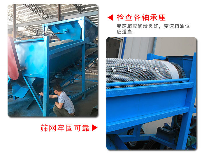 滾筒篩篩沙機主要由電機、減速機、滾筒裝置、機架、密封蓋、進料口、出料口等部分組成。滾筒裝置傾斜安裝于機架上。電動機經(jīng)減速機與滾筒裝置通過聯(lián)軸器連接在一起,驅(qū)動滾筒裝置繞其軸線轉(zhuǎn)動。當物料進入滾筒裝置后,由于滾筒裝置的傾斜與轉(zhuǎn)動,使篩面上的物料翻轉(zhuǎn)與滾動,使合格物料(篩下產(chǎn)品)經(jīng)滾筒后端底部的出料口排出,不合格的物料(篩上產(chǎn)品)經(jīng)滾筒尾部的排料口排出。由于物料在滾筒內(nèi)的翻轉(zhuǎn)、滾動,使卡在篩孔中的物料可被彈出,防止篩孔堵塞。