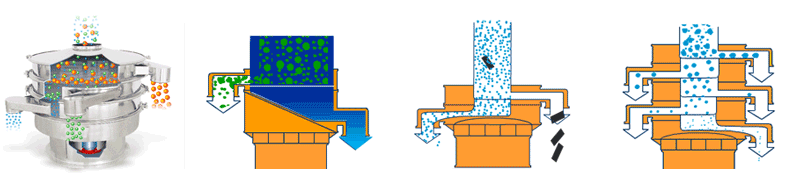 | 應用 | 要用于物料原料的篩分和成品的最終生產檢驗,可以去除產品中的結塊和污染物,一次操作最多可提供5級分級。 | 適合高粘性、高靜電細粉,篩分精度可以提高80%以上,產量提高2-5倍。 | 模擬人工篩分的動作,產生了水平和投擲的三維滾動運動,適用于500目以內的細粒狀物料,篩分精度提高了90-95%,產量是圓形振動篩的5-10倍。 | 適合一般的粗略篩分或除雜,的進、出料口設計在同一垂直方向上,這樣會加快物料的排料速度,處理量是普通圓形振動篩的2-5倍。 | 經常用在液體過濾行業,可去除液體或懸浮物中存在的不需要的顆粒,當然也是可以作為粉末除雜。可用在處理量較小的工廠或小型作坊。 |